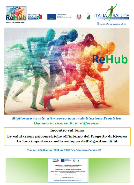 Il 06 Settembre 2024 ore 15:00 presso la sede operativa di Via Vincenzo Comi n.33 a Teramo, Incontro sul tema “Le valutazioni psicosometriche all’interno del Progetto di Ricerca. La loro importanza nello sviluppo dell’algoritmo di IA”